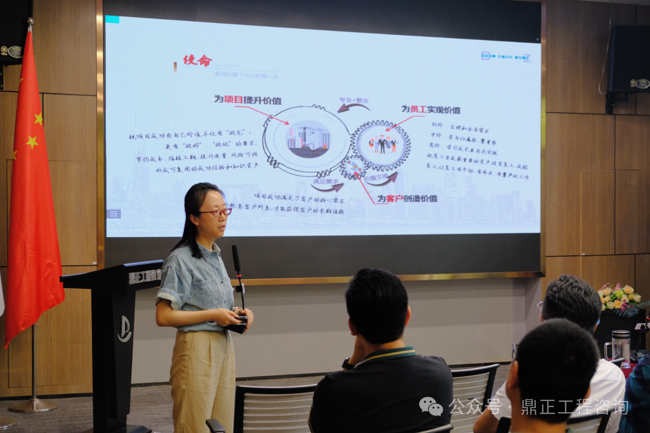 會議伊始,毛迎霞總經理宣貫了《以價值創造者為本的鼎正文化體系》,緊扣“價值創造”這一核心要義,全面解讀了企業文化升級后的使命、愿景、價值觀及人才觀。